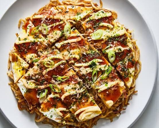 • Depois de pronto, coloque o okonomiyaki em um prato e cubra com molho tonkatsu e maionese.
