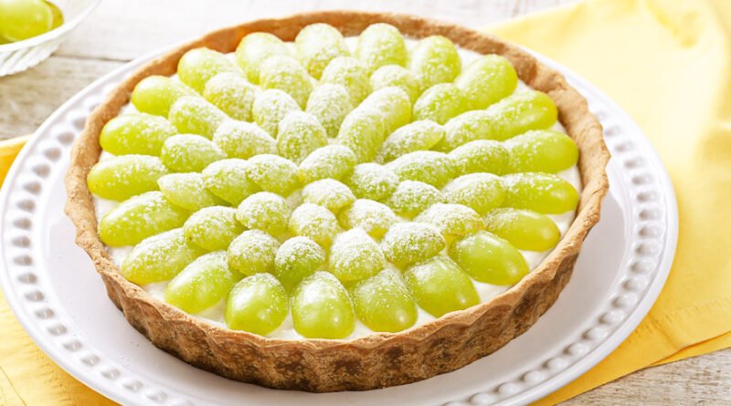 - Despeje o creme sobre a massa e finalize com as uvas.